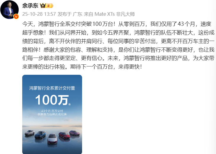 华为常务董事、终端BG董事长余承东10月28日通过个人微博宣布,鸿蒙智行全系交付已突破100万台。从零到百万,鸿蒙智行仅用了43个月,这一交付速度超越了理想(58个月)和零跑(75个月)等竞争对手,成为中国新能源汽车市场成长速度最快的品牌之一。