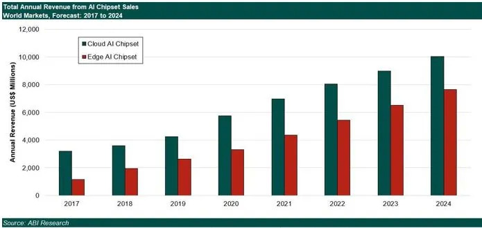 有分析认为,AI技术将成为移动互联网时代向物联网时代过渡的突破点。2018年,ReportLinker市场调研公司在报告中预测,到2023年,全球人工智能芯片市场规模将达到108亿美元,复合年均增长率将达到53.6%。赛迪顾问发布的《中国人工智能芯片产业发展白皮书》中显示,2018 年中国AI芯片市场规模达到80. 8 亿元,同比增长50.2%。