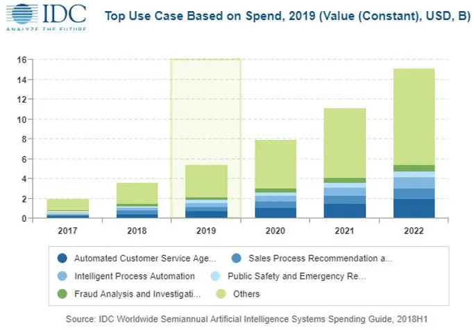 IDC 2019上半年发布的《全球半年度人工智能系统支出指南》预测,2019年亚太地区在人工智能系统上的支出将达到55亿美元,比2018年增长近80%,按照50%的复合年增长率计算,预计在2022年AI支出将激增至150亿美元。尽管整个亚太地区的支出都将增加,但IDC发现中国将主导亚太市场。