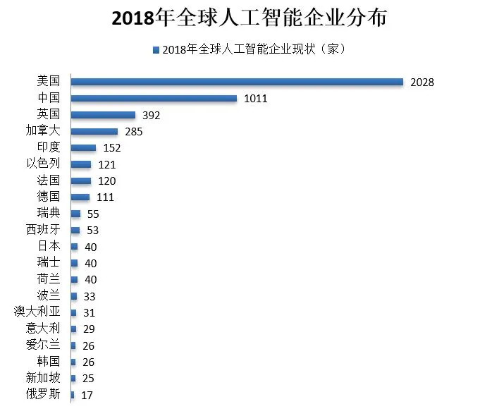 据统计,截至2018年6月,全球人工智能企业总数达4925家,其中美国企业数2028家,位列全球第一,中国仅居其后,位列第二,企业总数达1011家。