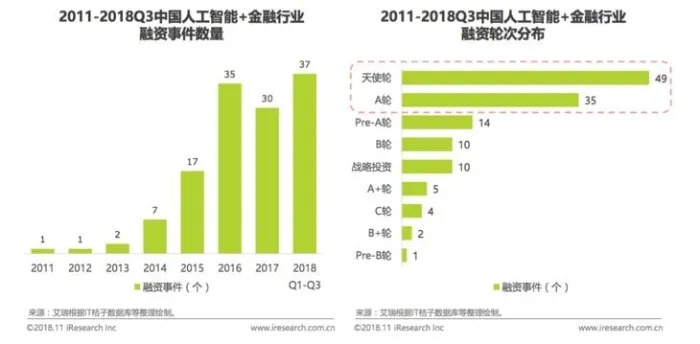 根据艾瑞咨询2018年发布的《中国人工智能+金融行业研究报告》显示,2011年至2018年第三季度金融AI累计融资130起,自2016年起融资事件均超过30起。