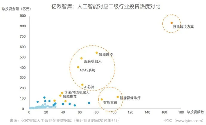 IDC指出,基于场景落地的广阔性、时效性和花费成本来说,目前约有70%的行业正在投资于AI解决方案。除了AI解决方案,亿欧智库指出智能风控、服务机器人、ADAS系统以及AI芯片等领域的投资频次和金额也较为理想。