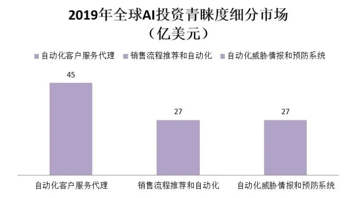 2019年投资资金最多的AI细分领域是自动化客户服务代理,花费近45亿美元;销售流程推荐和自动化排名第二,全年支出超过27亿美元;自动化威胁情报和预防系统投资为27亿美元。