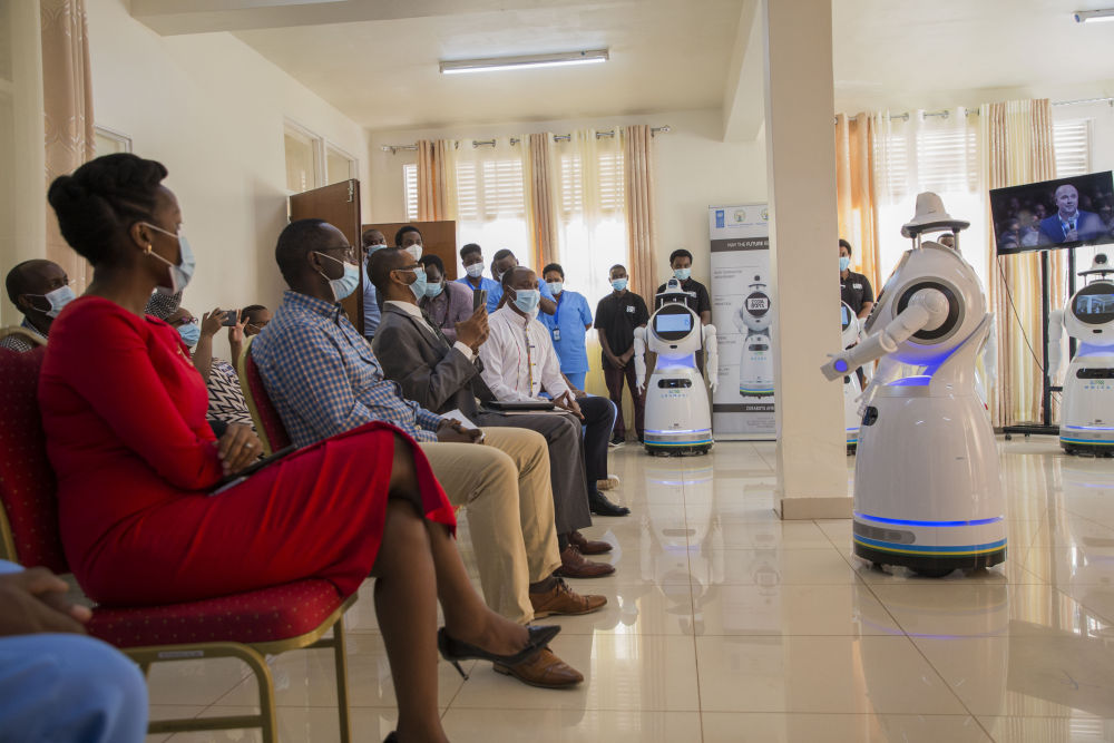 5月19日,在卢旺达首都基加利,人们观看一台智能移动机器人做自我介绍。(新华社发,西里尔·恩德格亚摄)