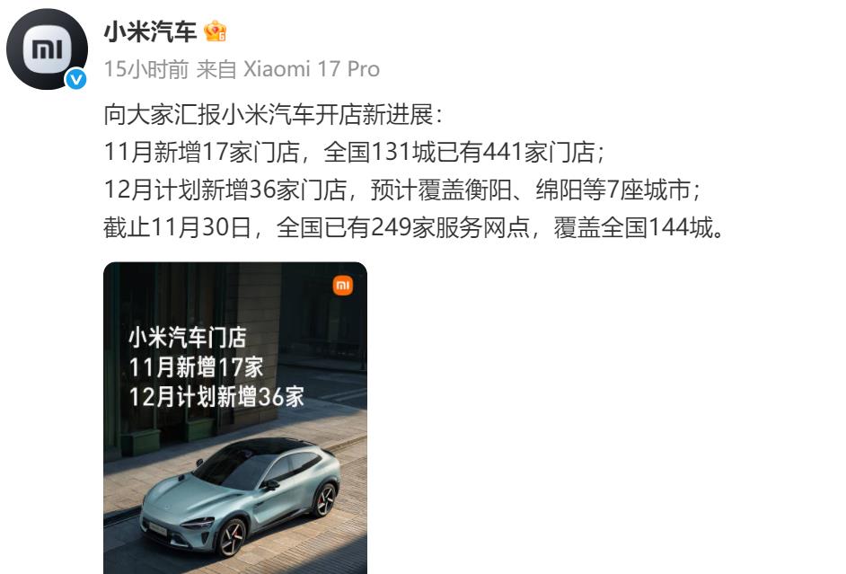 12月1日消息,小米汽车官方在社交平台公布其开店新进展: