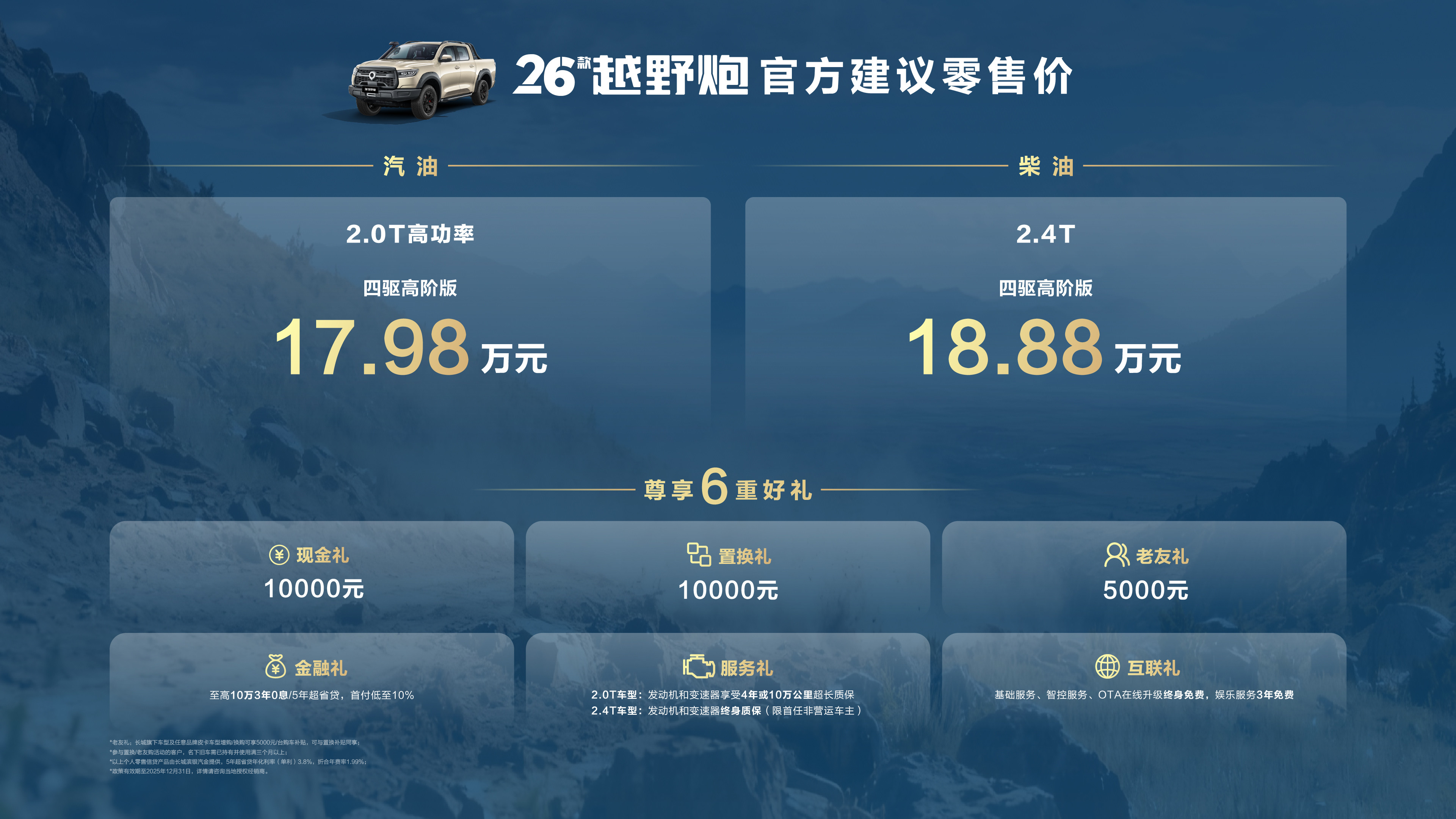 购车用户还可享多重上市礼遇诚意满满2026款商用炮用户可享6000元现金礼、5000元置换礼、3000元老友礼以及金融礼、服务礼五重大礼;2026款乘用炮可享受6000元现金礼、5000元置换礼、3000元老友礼以及金融礼、服务礼、互联礼六重大礼;2026款越野炮用户则可享10000元现金礼、10000元置换礼、5000元老友礼以及金融礼、服务礼、互联礼六重大礼