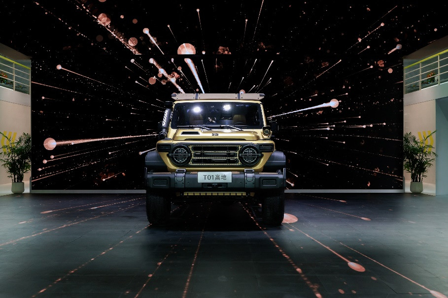 造型上,T01高地延续212家族「一拱、二圆、三横」设计语言,前罩进气格栅如山峦隆起,呼应“高地”之名;专属“晨曦金”车身配色搭配“高地纹”内饰与车身贴,辅以防滑侧踏板、瞄准镜式门把手、迫击炮式涉水喉、武装带安全扣前保、防爆网灯罩等拓展件,实现功能性与视觉张力的双重强化。
